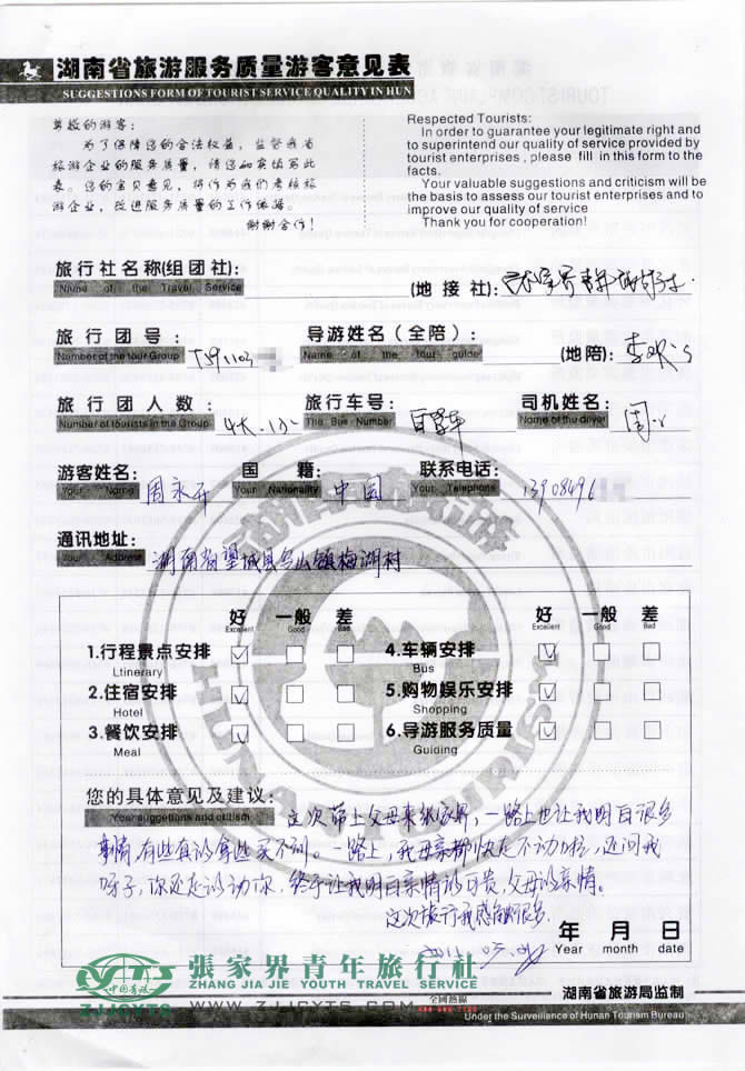 湖南望城縣“周先生”與張家界青旅旅游顧問(wèn)——宋嘉在3月17日取得聯(lián)系,經(jīng)過(guò)3次的商談,雙方達(dá)成協(xié)議并簽訂了《國(guó)內(nèi)旅游組團(tuán)標(biāo)準(zhǔn)合同》,于3月22日中午抵達(dá)張家界,之后便開(kāi)始了愉快的張家界之旅。 此次行程是由我們優(yōu)秀導(dǎo)游——李歡,負(fù)責(zé)旅游接待工作,李導(dǎo)在旅游過(guò)程中,景點(diǎn)講解詳細(xì),全程服務(wù)周到,周先生及家人很滿意。