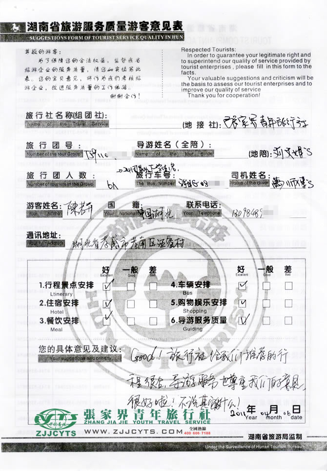 湖北孝感市“陳先生”與張家界青旅旅游顧問——“李芳瓊”在3月20日取得聯(lián)系,經(jīng)過3次的在線商談后,雙方達(dá)成協(xié)議并簽訂了《國內(nèi)旅游組團(tuán)標(biāo)準(zhǔn)合同》,陳先生6人一行于4月2日晚抵達(dá)張家界,之后便開始為期4天行程的玩轉(zhuǎn)湘西之旅。 此次行程是由我們優(yōu)秀導(dǎo)游——?jiǎng)⑽木辏?fù)責(zé)旅游接待工作,劉導(dǎo)在旅游過程中講解詳細(xì),服務(wù)周到,客人也很滿意。并給予導(dǎo)游服務(wù)較高的評價(jià)!