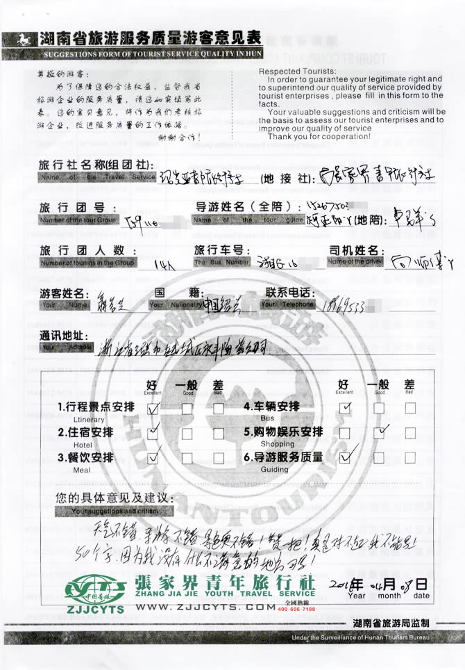 浙江紹興市“翁女士”與張家界青旅旅游顧問——“李芳瓊”在3月28日取得聯(lián)系,翁女士并將同行貴賓的具體情況和我們做了詳細溝通,我社也做了相應(yīng)之協(xié)調(diào);另在此之前,我社已與“浙江紹興亞都旅行社”接洽并確立合作,由我社負責(zé)地接安排,并與之簽訂了地接協(xié)議;翁女士14人一行(含全陪1人)于4月4日抵達張家界市,次日便開始了為期4天行程暢游張家界之旅。 此次行程是由我社優(yōu)秀導(dǎo)游——“盧 群”,負責(zé)旅游接待工作,盧導(dǎo)在旅游過程中講解詳細,服務(wù)周到,客人對整體安排也很滿意。并給予導(dǎo)游服務(wù)較高的評價!