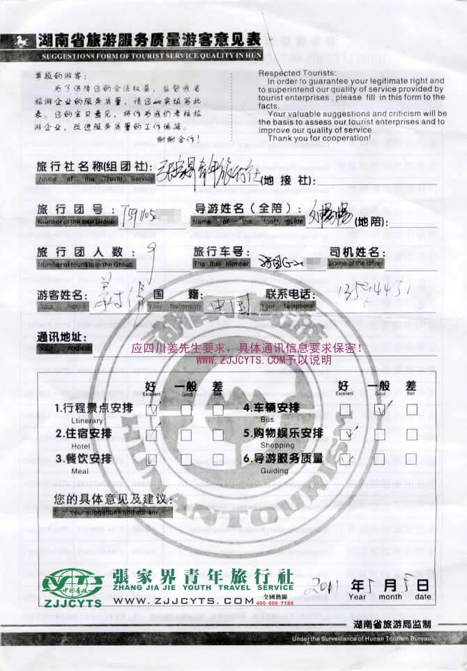 過程細節(jié)再現(xiàn) :“北京張小姐在4月23日與青旅客服經(jīng)理“張德建先生”取得聯(lián)系,并通過多次在線以及電話溝通,最終在4月26日,雙方達成共識并簽訂了《國內(nèi)旅游標準合同》,確立由我方負責“北京雅虎公司”貴賓一行9人的接待任務,其中有8人張小姐原籍地四川家人一行于4月29日,自駕車經(jīng)自四川啟程,經(jīng)貴州、常德、澧縣、武陵源等地,晚10點許抵達張家界市,張小姐1人乘自【北京-張家界】直航飛機于同日晚也抵達張家界市,次日之后便開始了3天行程的走進美麗的張家界純玩之旅。