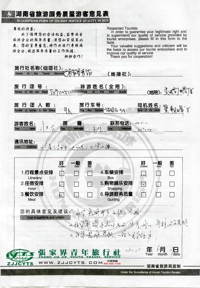 在此感謝大連保稅區(qū)金鑫石油公司武女士以及吳總一行9位貴賓,給予張家界中青旅為貴賓一行服務的機會,同時也感謝貴賓一行對我社行程及導游安排的配合與支持,歡迎武女士您和家人、朋友們有空再次蒞臨美麗的張家界做客觀光。--客服經(jīng)理“張德建”留言。