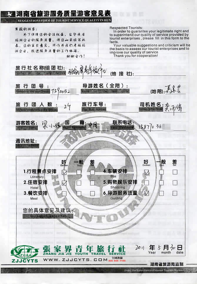 廣西柳州市“梁女士”與張家界青旅旅游顧問——客服“田秋萍”在5月12日取得聯(lián)系,并與廣西柳州梁小姐以及其丈夫paul先生(英國籍貫),就旅游行程和服務(wù)標(biāo)準(zhǔn)等問題、還有返程火車票代訂問題,做了深層次的在線溝通,此后經(jīng)過細(xì)致的商磋,最終在5月21日才確立《國內(nèi)旅游組團(tuán)接待合同》,并委托我社預(yù)訂往返返程火車票。并且確立由我社負(fù)責(zé)全程接待安排;梁女士一行2人于5月28日乘坐K1474次自柳州出發(fā),次日上午九時(shí)許抵達(dá)張家界市,我社安排導(dǎo)游“聶素珍”鮮花迎接。之后便開始了3天行程的走進(jìn)的美麗張家界之旅。 5月30日下午16:00許結(jié)束行程,由我司車輛送往張家界火車站。2位貴賓搭乘K1473次返程。