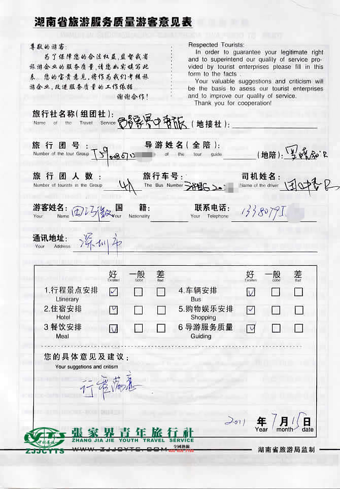 廣東深圳市“田女士”與張家界青旅旅游顧問——客服“黃靜”在6月19日得聯(lián)系,并就線路、行程的合理選擇、旅游景點(diǎn)的分布,以及服務(wù)的具體要求、范圍,做了多次在線溝通和電話溝通,經(jīng)過細(xì)致的商磋,最終在07月04日確立《國內(nèi)旅游組團(tuán)接待合同》,并正式確立由我社負(fù)責(zé)全程接待安排;田女士一行4人(2名滿60歲老人),于07月11日中午乘坐K9064次空調(diào)特快,于次日7月12日凌晨03:45許抵達(dá)張家界火車站,我社導(dǎo)游和司機(jī)前往迎接站,并安排入住酒店做了短暫的休息。當(dāng)日上午9點(diǎn)便開始了為期4天行程的走進(jìn)魅力湘西之旅。 07月15日下午在鳳凰古城脫團(tuán),自貴賓自主赴懷化搭乘火車返程回深圳。