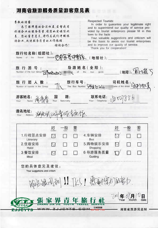 湖北武漢市“周先生”與張家界青旅旅游顧問——客服“田秋萍”在7月17取得聯(lián)系,并與負責此次旅行活動的主要聯(lián)系人“周先生”,就合理的選擇行程、旅游過程的具體要求、服務范圍、住宿的安排,做了多次在線溝通和電話溝通,經(jīng)過細致的商磋,最終在07月29日正式簽訂《國內(nèi)旅游組團接待合同》,由我社負責全程接待安排;周先生親率貴賓一行7人,于08月07日搭乘K967/K966次火車,次日上午12:30許抵達張家界,當日便開始了為期3天行程的走進張家界之旅。 08月10日下午送團,貴賓搭乘火車返程