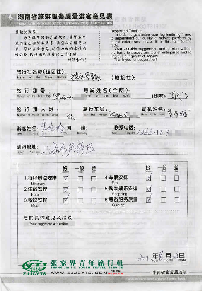 上海盧灣區(qū)“朱小姐”與張家界青旅旅游顧問(wèn)——客服“卓東來(lái)”在08月12日得聯(lián)系,并就線路、行程的合理選擇、旅游景點(diǎn)的選定,以及服務(wù)的具體要求、范圍,做了多次在線溝通和電話溝通,經(jīng)過(guò)細(xì)致的商磋,最終在08月14日雙方簽訂了《國(guó)內(nèi)旅游組團(tuán)接待合同》,并正式確立由我社負(fù)責(zé)全程接待安排;朱小姐一行3人(隨行成員中有1名位滿70歲老人),于08月18午乘坐K533次空調(diào)特快,于次日8月19午7:00許抵達(dá)張家界火車站,我社導(dǎo)游和司機(jī)前往迎接站,當(dāng)日便開(kāi)始了為期4天行程的走進(jìn)魅力湘西之旅。 08月22日下午12點(diǎn)鐘自鳳凰古城返程張家界,搭乘K1374次返程。