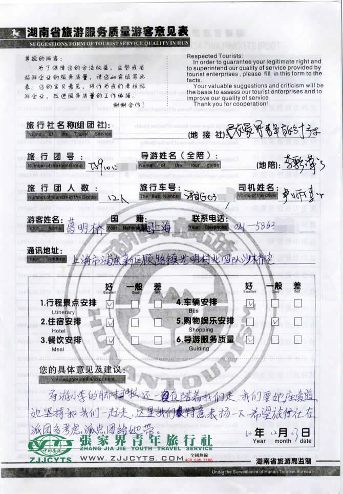 再次感謝葛先生一行選擇張家界青年旅行社,以及您對張家界青旅的信任與支持。我們會繼續(xù)努力,期待再次得到您關(guān)注。祝您生意興隆,工作順利!--陳苑梅留言