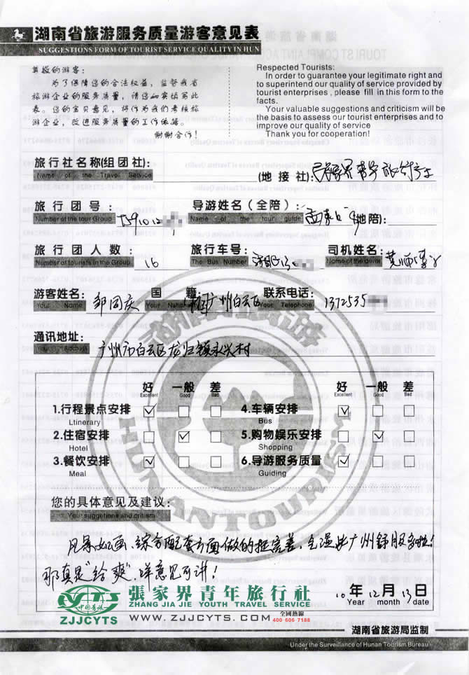再次感謝鄒先生一行選擇張家界青年旅行社,以及您對張家界青旅的信任與支持。我們會繼續(xù)努力,做好旅游接待工作。期待下一次與您的合作,祝您愉快!--陳苑梅留言