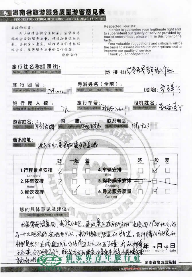 北京懷柔縣“韓女士”與張家界青旅旅游顧問——陳苑梅在2010年12月13日取得聯(lián)系,經(jīng)過2次的商談,雙方達成協(xié)議并簽訂了《國內(nèi)旅游組團標準合同》,韓女士7人一行于12月20日晚抵達長沙,之后便開始了4天行程的張家界之旅。 此次行程是由我們優(yōu)秀導(dǎo)游——盧群,負責(zé)旅游接待工作,盧導(dǎo)在旅游過程中講解詳細,服務(wù)周到,客人非常滿意。并給導(dǎo)游服務(wù)較高評價!