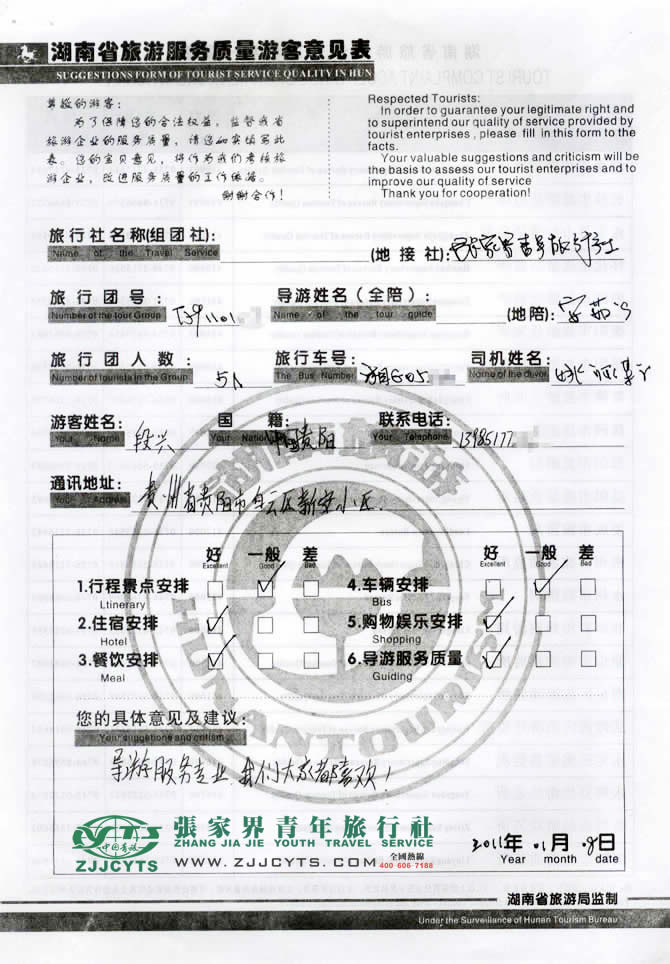 貴州貴陽市“段先生”與張家界青旅旅游顧問——陳苑梅在2010年12月08日取得聯(lián)系,經(jīng)過幾次的商談,雙方達(dá)成協(xié)議并簽訂了《國內(nèi)旅游組團(tuán)標(biāo)準(zhǔn)合同》,于01月02日下午3點(diǎn)抵達(dá)張家界,之后便開始了湘西之旅。 此次行程是由我們優(yōu)秀導(dǎo)游——安茹,負(fù)責(zé)旅游接待工作,安導(dǎo)在旅游過程中講解詳細(xì),服務(wù)周到,客人也很滿意。并給予導(dǎo)游服務(wù)較高的評(píng)價(jià)。
