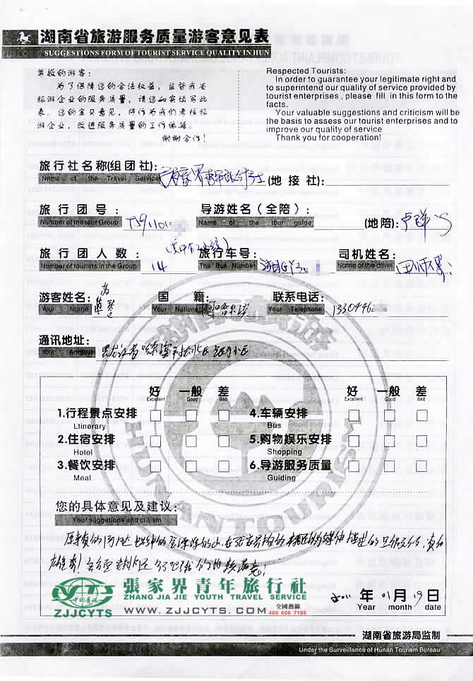 黑龍江哈爾濱市“芮女士”與張家界青旅旅游顧問——曹娟在01月07日取得聯(lián)系,經(jīng)過3次的商談,雙方達(dá)成協(xié)議并簽訂了《國內(nèi)旅游組團(tuán)標(biāo)準(zhǔn)合同》,于01月15日下午抵達(dá)張家界,之后便開始了迷人的湘西之旅。 此次行程是由我們優(yōu)秀導(dǎo)游——盧群,負(fù)責(zé)旅游接待工作,盧導(dǎo)在旅游過程中講解詳細(xì),服務(wù)周到,客人也很滿意。
