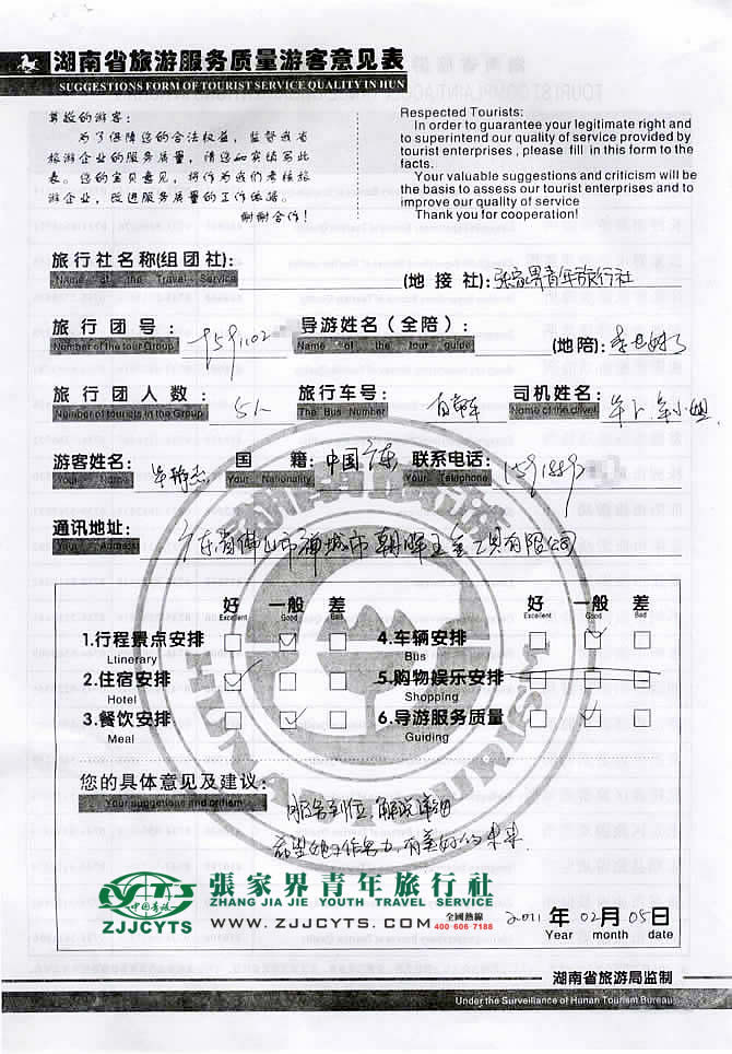 廣東佛山市“華先生”與張家界青旅旅游顧問——曹娟在01月10日取得聯(lián)系,經(jīng)過幾次的商談,雙方達(dá)成協(xié)議并簽訂了《國內(nèi)旅游組團(tuán)標(biāo)準(zhǔn)合同》,華先生一行5人自駕車于01月29日中午抵達(dá)張家界,之后便開始了在張家界過年度假之旅。 此次行程是由我們優(yōu)秀導(dǎo)游——李世妹,負(fù)責(zé)旅游接待工作,李導(dǎo)在旅游過程中講解詳細(xì),服務(wù)周到,客人也很滿意。并給予導(dǎo)游服務(wù)“服務(wù)到位,解說詳細(xì)”評價(jià)!