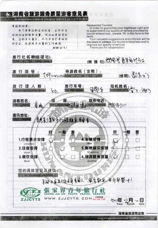 貴州六盤(pán)水市“晏女士”與張家界青旅旅游顧問(wèn)——陳苑梅在02月04日取得聯(lián)系,經(jīng)過(guò)2次的商談,雙方達(dá)成協(xié)議并簽訂了《國(guó)內(nèi)旅游組團(tuán)標(biāo)準(zhǔn)合同》,于02月07日下午抵達(dá)張家界,之后便開(kāi)始了走進(jìn)湘西之旅。 此次行程是由我們優(yōu)秀導(dǎo)游——孟素素,負(fù)責(zé)旅游接待工作,孟導(dǎo)在旅游過(guò)程中講解詳細(xì),服務(wù)周到,客人也很滿意。并給予導(dǎo)游服務(wù)“有修養(yǎng)的人,服務(wù)敬業(yè)”好評(píng)!