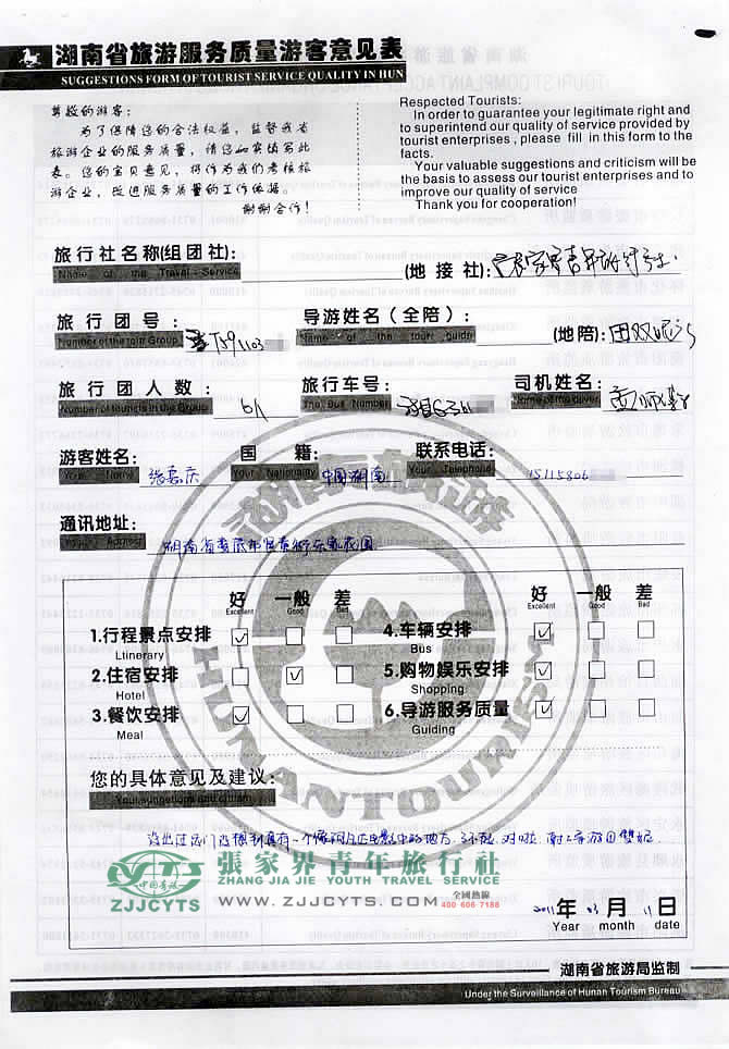 湖南婁底市“張先生”與張家界青旅旅游顧問——張瑜珂在03月06日取得聯(lián)系,經(jīng)過2次的商談,雙方達(dá)成協(xié)議并簽訂了《國內(nèi)旅游組團(tuán)標(biāo)準(zhǔn)合同》,于3月08日晚抵達(dá)張家界,次日便開始了湘西之旅。 此次行程是由我們優(yōu)秀導(dǎo)游——田雙妮,負(fù)責(zé)旅游接待工作,田導(dǎo)在旅游過程中講解詳細(xì),服務(wù)周到,客人也很滿意。并給予導(dǎo)游服務(wù)品質(zhì)高評(píng)價(jià)!