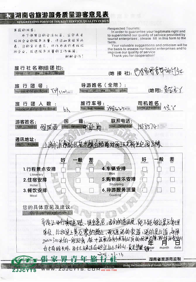 上海浦東新區(qū)“程先生”與張家界青旅旅游顧問——李芳瓊在3月12日取得聯(lián)系,經(jīng)過2次的商談,雙方達(dá)成協(xié)議并簽訂了《國內(nèi)旅游組團(tuán)標(biāo)準(zhǔn)合同》,于3月14日中午自長沙抵達(dá)張家界,之后便開始了愉快的張家界之旅。 此次行程是由我們優(yōu)秀導(dǎo)游——房家良,負(fù)責(zé)旅游接待工作,房導(dǎo)在旅游過程中講解詳細(xì),服務(wù)周到,客人比較滿意。