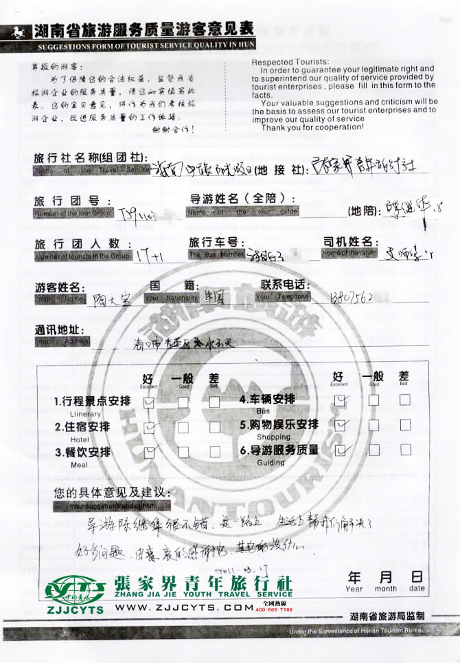 海南?谑“陶先生”與張家界青旅旅游顧問——曹娟在3月08日取得聯(lián)系,經(jīng)過2次的商談,雙方達成協(xié)議并簽訂了《國內(nèi)旅游組團標準合同》,于3月13日晚上抵達張家界,之后便開始了愉快的湘西之旅。 此次行程是由我們優(yōu)秀導游——陳繼華,負責旅游接待工作,陳繼華導游在旅游過程中,服務周到,景點講解詳細,客人非常滿意。并給予“導游很不錯,我們由衷的感謝他”等好評!