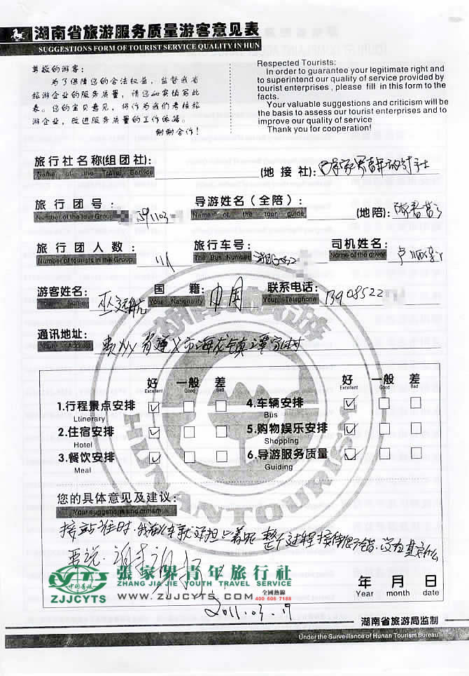 貴州遵義市“巫先生”與張家界青旅旅游顧問——蔣麗嬌在3月13日取得聯(lián)系,經(jīng)過2次的商談,雙方達(dá)成協(xié)議并簽訂了《國內(nèi)旅游組團(tuán)標(biāo)準(zhǔn)合同》,于3月16日下午抵達(dá)張家界,之后便開始了愉快的張家界之旅。 此次行程是由我們優(yōu)秀導(dǎo)游——陳春芳,負(fù)責(zé)旅游接待工作,陳導(dǎo)在旅游過程中講解詳細(xì),服務(wù)周到,客人也很滿意。并給予導(dǎo)游服務(wù)“整個(gè)接待過程很不錯”好評!