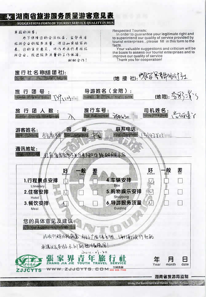 江蘇南京市“駱先生”與張家界青旅旅游顧問——宋嘉在3月9取得聯(lián)系,經(jīng)過(guò)2次商談,雙方達(dá)成協(xié)議并簽訂了《國(guó)內(nèi)旅游組團(tuán)標(biāo)準(zhǔn)合同》,于3月16午抵達(dá)張家界,之后便開始了湘西之旅。 此次行程是由我們優(yōu)秀導(dǎo)游——李彩萍,負(fù)責(zé)旅游接待工作,李導(dǎo)在旅游過(guò)程中講解詳細(xì),服務(wù)周到,客人也很滿意。并給予導(dǎo)游服務(wù)評(píng)價(jià):“感謝導(dǎo)游小劉的熱情陪同”!