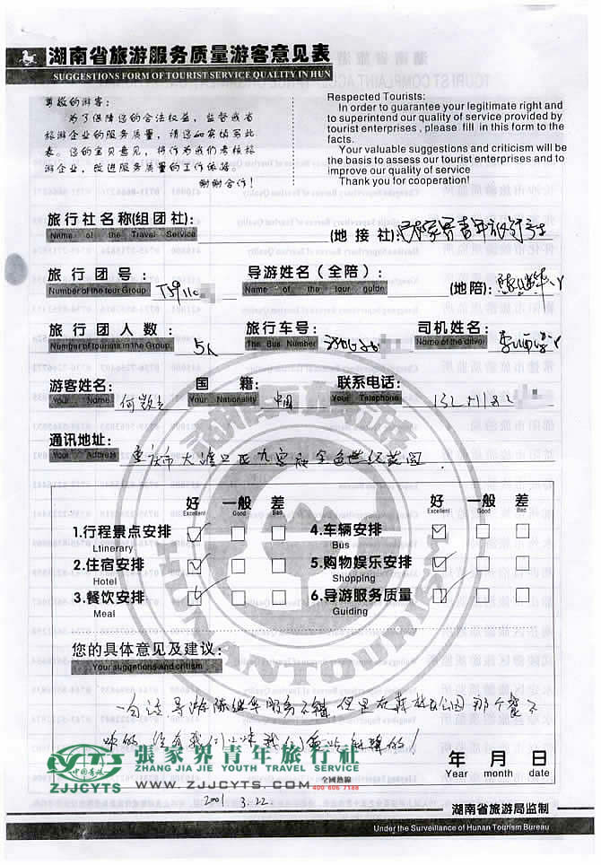 重慶大渡口“何先生”與張家界青旅旅游顧問——張瑜珂在3月10日取得聯(lián)系,經(jīng)過2次的商談,雙方達(dá)成協(xié)議并簽訂了《國內(nèi)旅游組團(tuán)標(biāo)準(zhǔn)合同》,于3月18日晚抵達(dá)張家界,之后便開始了愉快的張家界之旅。 此次行程是由我們優(yōu)秀導(dǎo)游——陳繼華,負(fù)責(zé)旅游接待工作,陳導(dǎo)在旅游過程中,充分發(fā)揮自己的語言能力,講解詳細(xì),服務(wù)周到,客人也很滿意。并給予導(dǎo)游服務(wù),給予服務(wù)不錯的品質(zhì)好評!