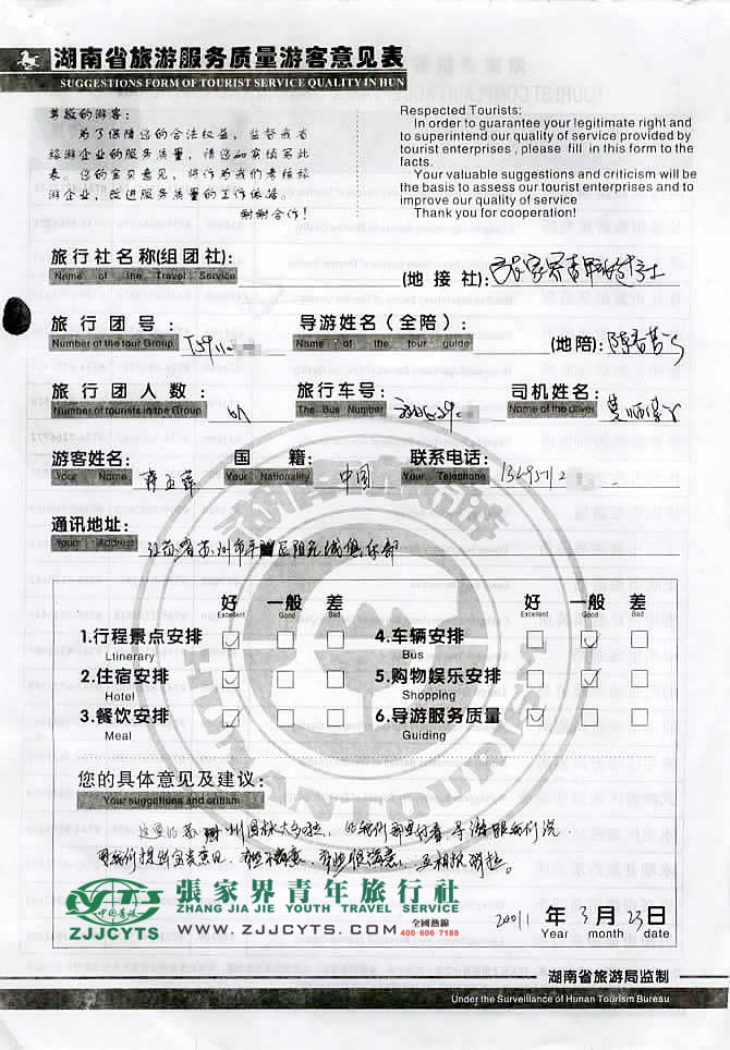 江蘇蘇州市“蔣女士”與張家界青旅旅游顧問——張勝蘭在3月17日取得聯(lián)系,經(jīng)過一次的商談,雙方達(dá)成協(xié)議并簽訂了《國內(nèi)旅游組團(tuán)標(biāo)準(zhǔn)合同》,于3月20日晚上抵達(dá)張家界,之后便開始了愉快的湘西之旅。 此次行程是由我們優(yōu)秀導(dǎo)游——陳春芳,負(fù)責(zé)旅游接待工作,陳導(dǎo)在旅游過程中,服務(wù)周到,景點(diǎn)講解詳細(xì),客人比較滿意。并給予了書面評價!